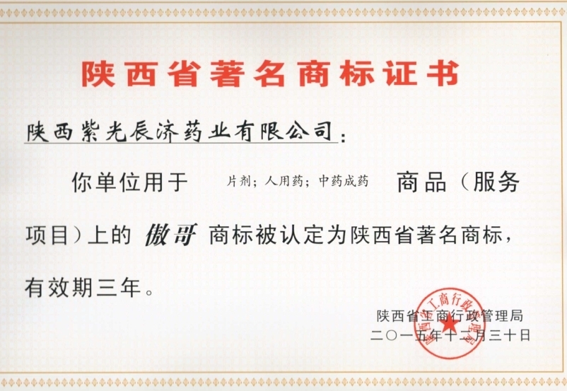 公司继“辰济”牌商标获陕西省著名商标称号后,又传来喜讯,我公司注册的“傲哥”商标获得了陕西省著名商标及宝鸡市知名商标荣誉称号。 实施商标战略是提升企业核心竞争力、促进企业做大做强的重要载体,也是企业转型升级,实现超越的有效途径。商标作为一种无形资产对于企业的发展更是管理价值的有效提升。公司于2000年取得了“傲哥”牌商标的注册证,开发了傲哥品牌。为树立品牌形象,经过近六十年的努力,公司走出一条属于自己的品牌兴企之路。 近年来,随着公司的快速发展,在增强自身实力的同时,紫光辰济药业始终把实施商标战略,提升企业核心竞争力作为快速发展的着力点,加快了企业自主知识产权和品牌的建设的步伐,建立了商标发展规划,明确了工作思路,进一步强化了工作措施,注重发挥商标在市场竞争中的作用,经过对“辰济”“傲哥”等品牌的大力宣传和产品销售,公司荣获了“陕西省著名商标”、“宝鸡市著名商标”“宝鸡市知名商标”等多项荣誉称号,为公司品牌发展战略提供了有力保障。