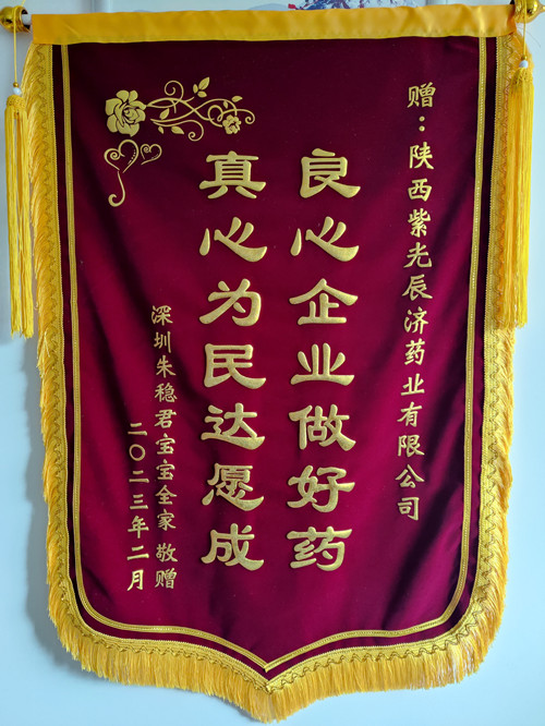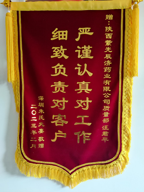 2023年元宵节刚过,正在忙碌上班的汪总工再次接到了陈女士的信息:汪部长,很不好意思,宝宝满月那天就想做面锦旗送给你们,以表达我们的感恩之情,但因后来一段时间深圳疫情严重,我们一家全阳了,忙于治疗和修养,时间耽误了。刚一过年我们就制作了锦旗,今天快递已送到贵公司门卫处,请查收。 打开包装精美的长条型方盒,展开两面烫着金字的旌旗,一方系赠星空官方网站(中国):“良心企业做好药,真心为民达愿成”;另一方赠技术总工汪君平:“严谨认真对工作,细致负责对客户”。医者仁心,看着金光闪耀的锦旗,汪总工眼眶有些润湿了。金杯银杯不及老百姓的口碑,这锦旗不仅是对培坤丸疗效的肯定,更是对紫光辰济这个百年老字号药企的认同和赞誉啊! 尽小者大,慎微者著,百年来紫光辰济人脚踏实地,守牢质量底线,用工匠精神坚持做好药,为人民,以疗效确切的产品赢得了消费者的良好口碑;未来发展之路上,紫光辰济将继续做好药品生产,充分发挥中医药的独特优势与作用,守正创新,不断进取,为人民健康提供坚实的保障。