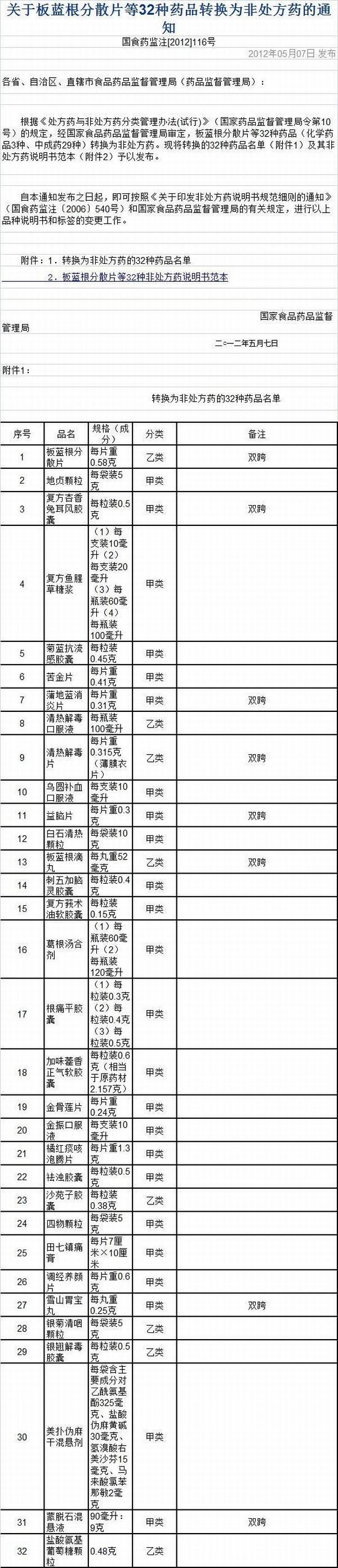 国食药监注[2012]116号 2012年05月07日 发布 各省、自治区、直辖市食品药品监督管理局(药品监督管理局): 根据《处方药与非处方药分类管理办法(试行)》(国家药品监督管理局令第10号)的规定,经国家食品药品监督管理局审定,板蓝根分散片等32种药品(化学药品3种、中成药29种)转换为非处方药。现将转换的32种药品名单(附件1)及其非处方药说明书范本(附件2)予以发布。 自本通知发布之日起,即可按照《关于印发非处方药说明书规范细则的通知》(国食药监注〔2006〕540号)和国家食品药品监督管理局的有关规定,进行以上品种说明书和标签的变更工作。 附件:1.转换为非处方药的32种药品名单 2.板蓝根分散片等32种非处方药说明书范本 国家食品药品监督管理局